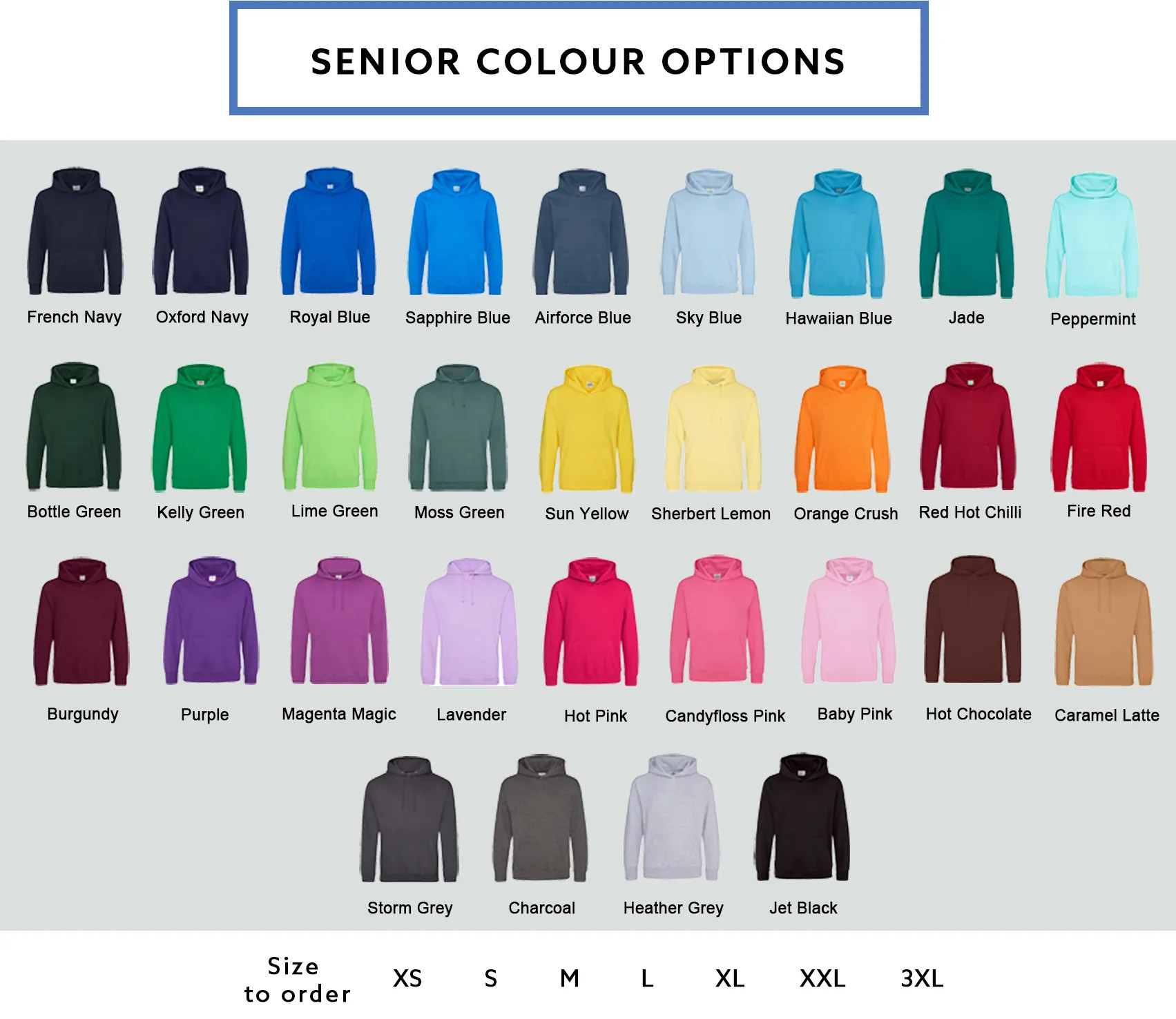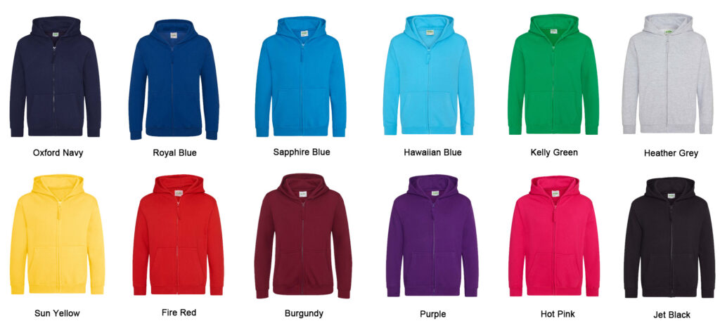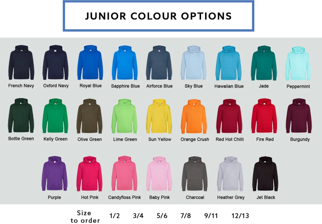 We offer a wide variety of garment colours which can be ordered together; however, ALL garments will have the same “Leavers” print and “School logo” colourway. For each order we offer 2 amendments to your Leavers design free of charge, subsequent amendments may incur a surcharge.